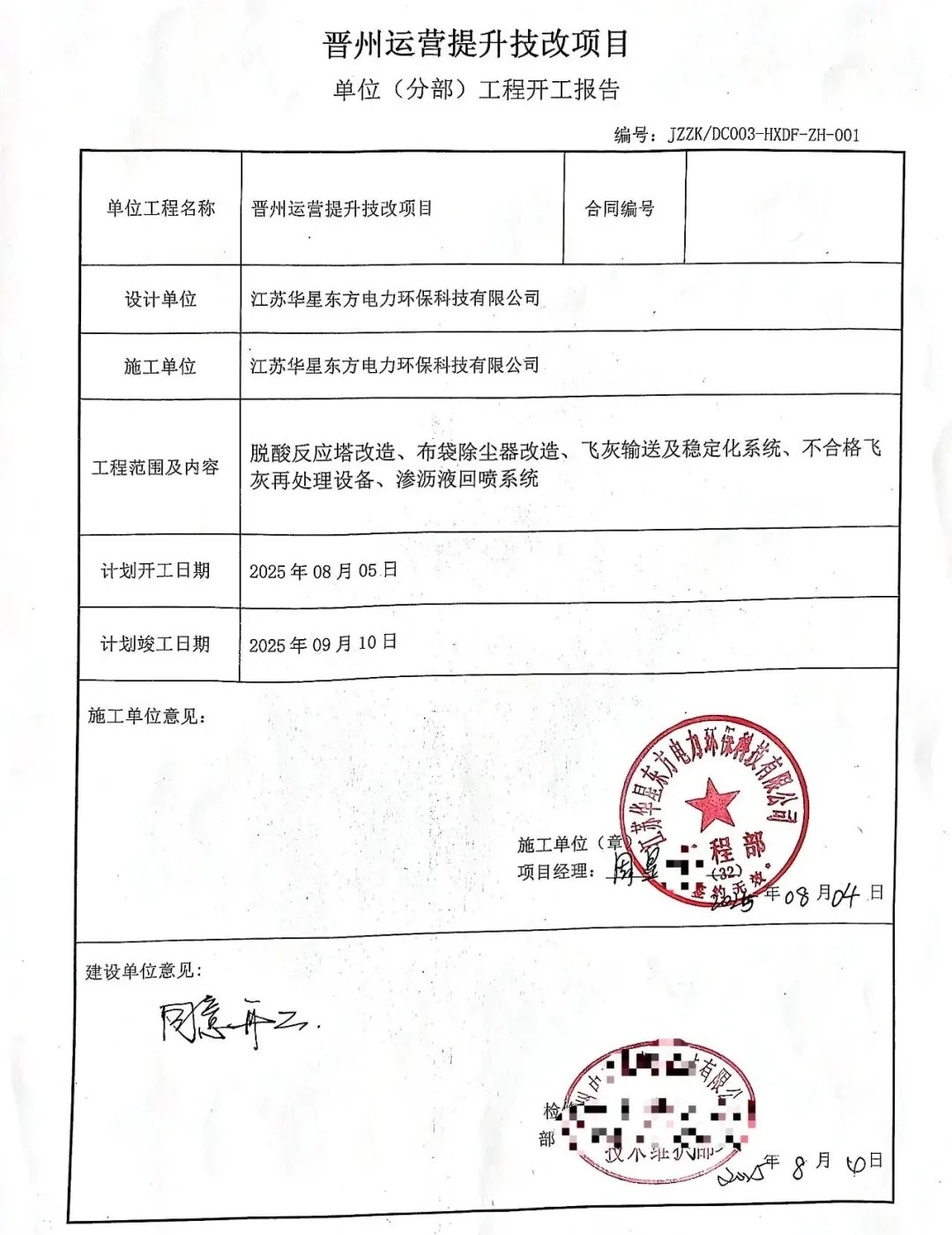 華星東方承建的河北省石家莊市晉州市生活垃圾焚燒發(fā)電提升技改項目煙氣凈化工程于2025年08月05號開工建設,于08月27號已安裝完成通過初步驗收。