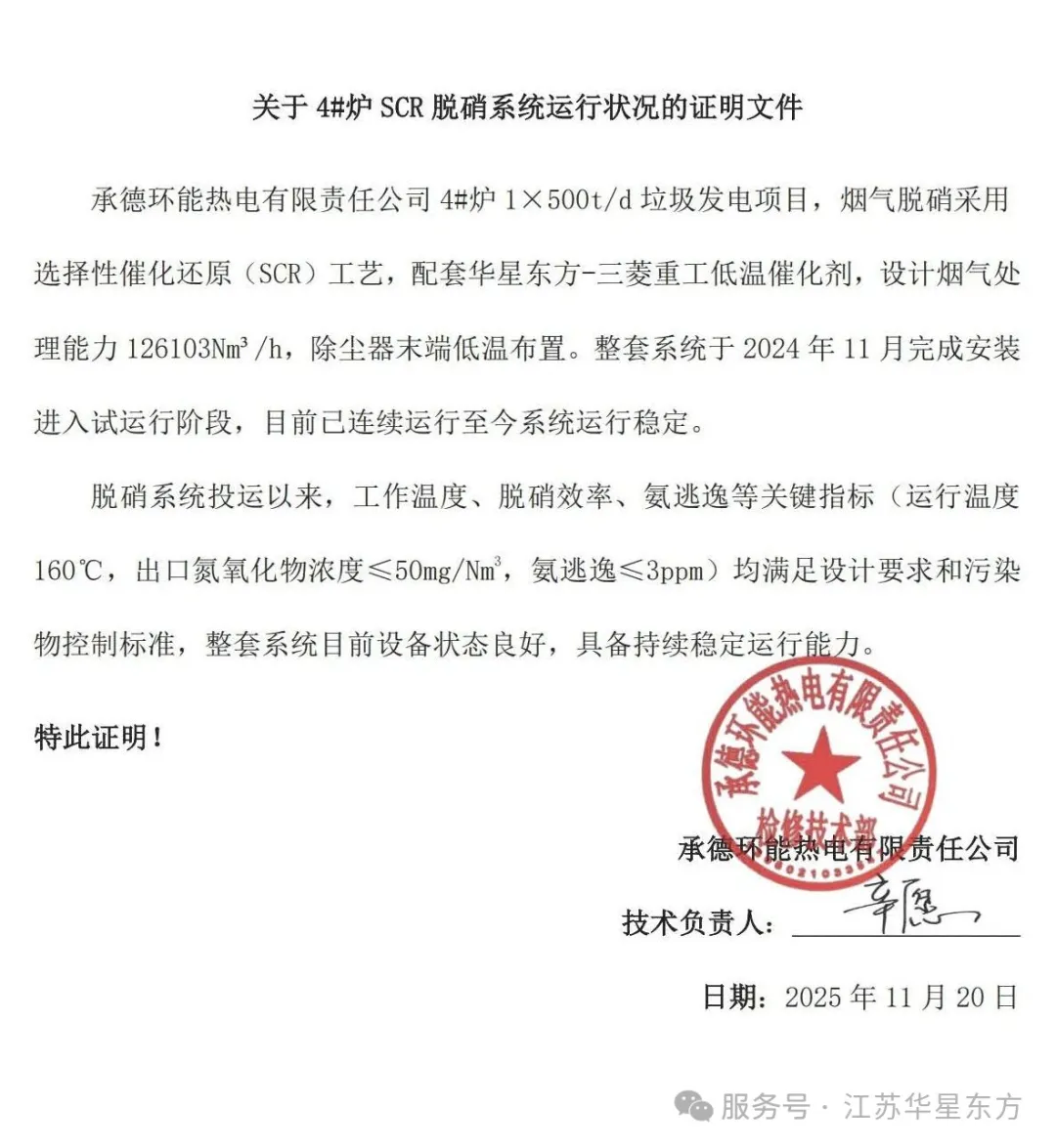 承德環(huán)能熱電有限責(zé)任公司#3、#4煙氣凈化系統(tǒng)提標(biāo)改造工程自2024年11月完成安裝進(jìn)入試運(yùn)行階段以來(lái),已連續(xù)穩(wěn)定運(yùn)行超過(guò)一年,該項(xiàng)目采用我司選擇性催化還原(SCR)工藝,配套華星東方引進(jìn)優(yōu)化的三菱重工低溫催化劑,目前系統(tǒng)運(yùn)行狀態(tài)良好,工作溫度、脫硝效率、氨逃逸等核心參數(shù)持續(xù)穩(wěn)定達(dá)標(biāo),且具備持續(xù)穩(wěn)定運(yùn)行能力,驗(yàn)證了華星東方低溫脫硝系統(tǒng)在低溫工況下的可靠性與高效性。 Since the completion of installation and the commencement of trial operation in November 2024, the FGC system upgrade for Units #3 and #4 of Chengde Huanneng Thermal Power Co., Ltd. has been running continuously and stably for over one year. The project adopts HEPT’s selective catalytic reduction (SCR) process, equipped with introduced & optimized MHIEC’s low-temperature catalysts. At present, the system is in good operating condition, with core parameters such as working temperature, denitration efficiency, and ammonia slip remaining stable and compliant, demonstrating sustained and reliable operation. This outcome verifies the reliability and high efficiency of HEPT’s low-temperature denitration system under low-temperature working conditions.