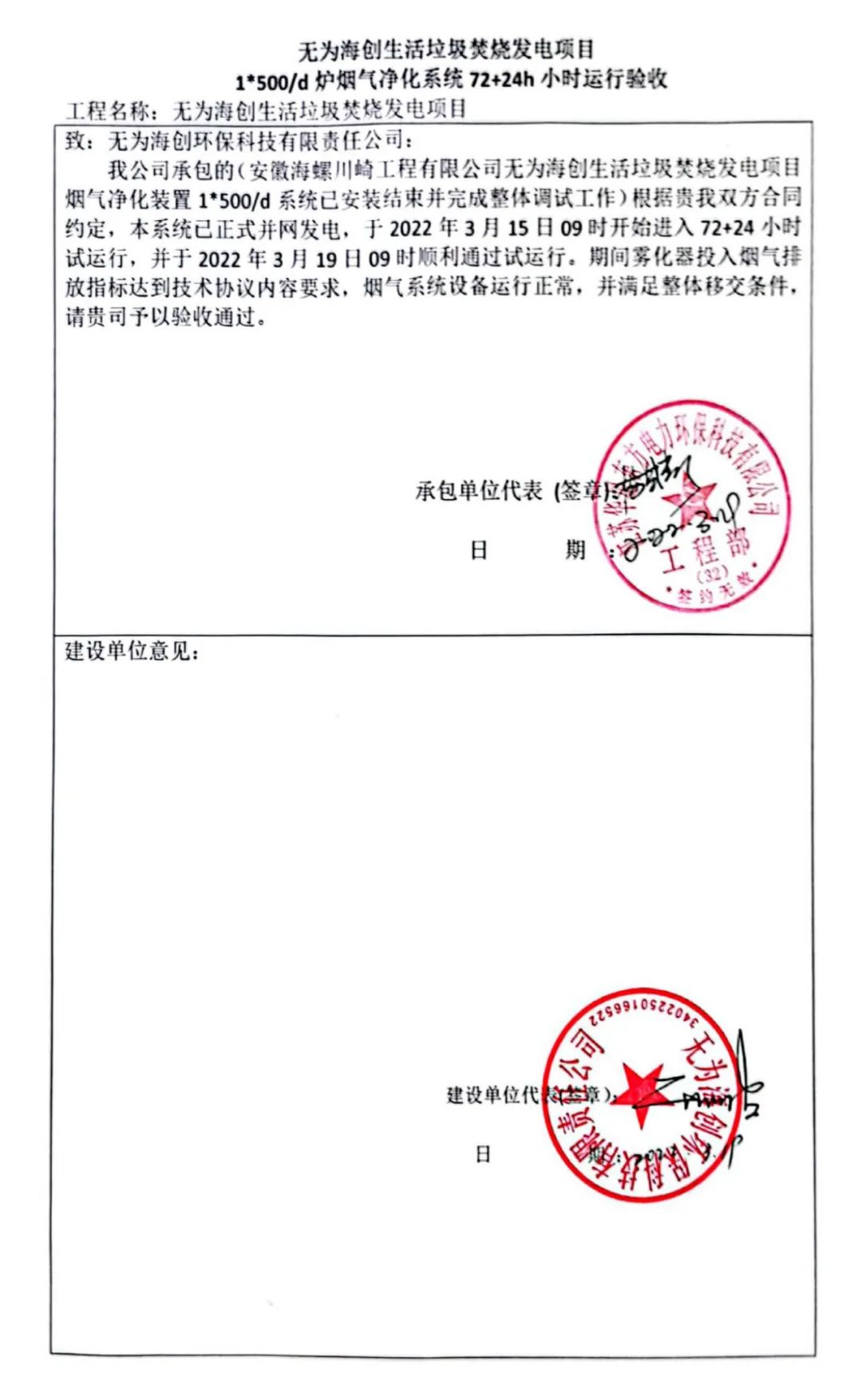 我公司承建的安徽省蕪湖市無為海創(chuàng)生活垃圾焚燒發(fā)電項(xiàng)目煙氣凈化工程于2022年3月19日通過72+24小時(shí)試運(yùn)行。
